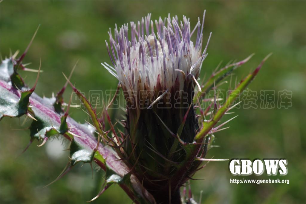 多年生草本,无茎,茎基粗厚,生多数不定根,顶生多数头状花序,外围莲座状叶丛。莲座状叶丛的叶全形倒披针形或椭圆形或长椭圆形,长6(10)-10(21)厘米,宽2.5(3.5)-3(7)厘米,羽状半裂、深裂或几全裂,基部渐狭成有翼的长或短叶柄,柄翼边缘有针刺或3-5个针刺组合成束;侧裂片4-7对,中部侧裂片稍大,全部侧裂片偏斜卵形或半椭圆形或半圆形,边缘有三角形刺齿及针刺,齿顶有针刺,齿顶针刺较长,长达1厘米,边缘针刺较短,长2-4毫米,基部的侧裂片常针刺化。叶两面同色,绿色,两面或沿脉或仅沿中脉被稠密或稀疏的多细胞长节毛。头状花序5-12个集生于茎基顶端的莲座状叶丛中。总苞钟状,直径2.5-3厘米。总苞片约6层,覆瓦状排列,向内层渐长;外层与中层长三角形至披针形,长1-2厘米,宽2-4毫米,顶端急尖,有长不足0.5毫米的短尖头;内层及最内层线状披针形至线形,长2.5-3厘米,宽2-3毫米,顶端膜质渐尖;全部苞片无毛。小花紫色,花冠长2.7厘米,檐部长1.2厘米,不等5浅裂,细管部长1.5厘米。瘦果淡黄色,楔状长椭圆形,压扁,长5毫米,宽1. 8毫米,顶端斜截形。冠毛白色或污白色或稍带褐色或带黄色;多层,基部连合成环,整体脱落;冠毛刚毛长羽毛状,长2.7厘米,向顶端渐细。花果期8-9月。
