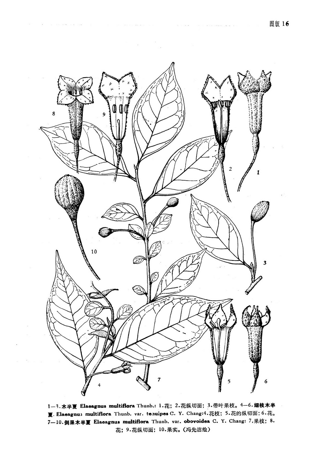 产陕西南部、湖北西部、四川东部的标本通常幼枝和果实具黄色鳞片;萼筒薄,黄色,散生少数银白色鳞片;叶片椭圆状披针形,长5-8厘米,宽15-2厘米,稍与原种有差异。1909年C. Servettaz根据湖北西部标本,在其专著中发表为E. multiflora subsp. eumultiflora β crispa Maxirn., 记载果梗长10-12毫米。1915年A. Rehder又根据了湖北西部标本,归人川西产的 E. muliflora f. angustata. Rehd.,他也注意到了与川西产的不同,即叶片较宽,上面幼时无星状柔毛;果梗长25-40毫米,但未见到花的标本。我们工作中看见了花和果实标本,其果实椭圆形,果梗长25-40毫米;萼筒较长,花柱无毛。我们认为产于鄂西和川东的E. multiflora. Thunb. f. angustata Rehd. 放入原变种内更恰当些。