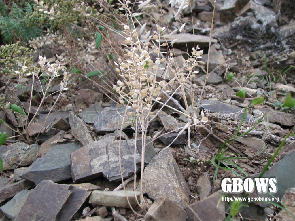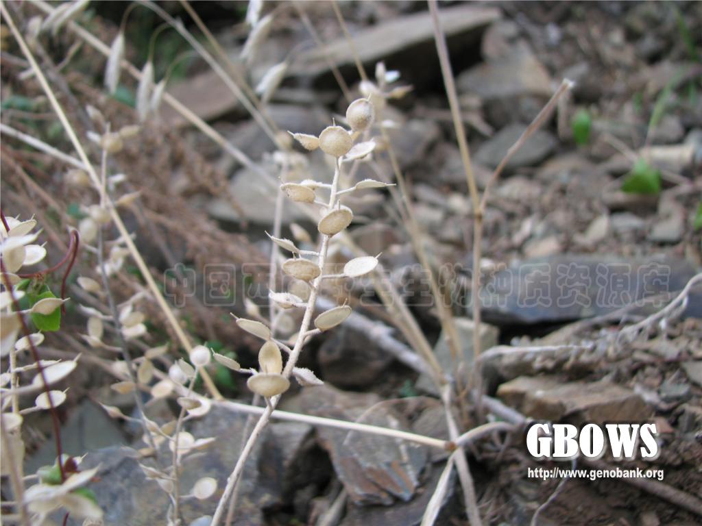 一年生草本,高10-20厘米,被贴伏毛。茎直立,中、上部分枝,分枝斜向上展开。基生叶早落,倒卵状长圆形至长圆状条形,长1.5-3厘米,宽3-6毫米,顶端尖,基部渐窄成柄。花序伞房状,果期伸长;萼片长圆状卵形,长2-2.5毫米,宽1-1.7毫米,外面有长辐枝星状毛,偶有2叉毛;花瓣黄色,前端1/3 处缢缩,成“吉塔”琴状,长2.75-3毫米,宽约1毫米,顶端2裂,下部渐窄成爪;长雄蕊花丝自1/3处向下渐宽,短雄蕊花丝内侧有附片,附片顶端有缺刻,向下渐窄,长约1.5毫米,宽约0.75毫米。短角果圆形,直径约5毫米,压扁,有边,宽约1毫米,花柱宿存。果瓣扁平,中间凸起。种子每室2粒,悬垂于室顶,淡棕褐色,卵状长圆形,长约2.5毫米,有宽边。花期5月。