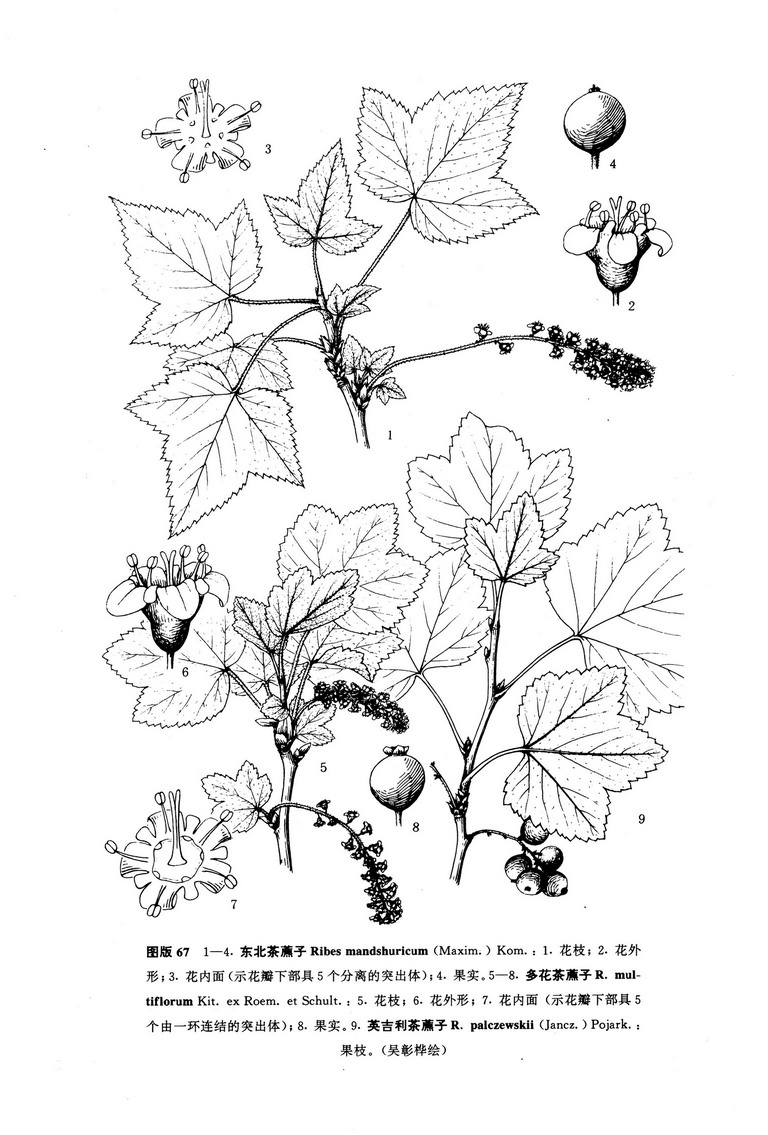 落叶灌木,高1-3米;小枝灰色或褐灰色,皮纵向或长条状剥落,嫩枝褐色,具短柔毛或近无毛,无刺;芽卵圆形或长圆形,长4-7毫米,宽1.5-3毫米,先端稍钝或急尖,具数枚棕褐色鳞片,外面微被短柔毛。叶宽大,长5-10厘米,宽几与长相似,基部心脏形,幼时两面被灰白色平贴短柔毛,下面甚密,成长时逐渐脱落,老时毛甚稀疏,常掌状3裂,稀5裂,裂片卵状三角形,先端急尖至短渐尖,顶生裂片比侧生裂片稍长,边缘具不整齐粗锐锯齿或重锯齿;叶柄长4-7厘米,具短柔毛。花两性,开花时直径3-5毫米;总状花序长7-16厘米,稀达20厘米,初直立后下垂,具花多达40-50朵;花序轴和花梗密被短柔毛;花梗长约1-3毫米;苞片小,卵圆形,几与花梗等长,无毛或微具短柔毛,早落;花萼浅绿色或带黄色,外面无毛或近无毛;萼筒盆形,长1-1.5 (2) 毫米,宽2-4毫米;萼片倒卵状舌形或近舌形,长2-3毫米,宽1-2毫米,先端圆钝,边缘无睫毛,反折;花瓣近匙形,长约1-1.5毫米,宽稍短于长,先端圆钝或截形,浅黄绿色,下面有5个分离的突出体;雄蕊稍长于萼片,花药近圆形,红色;子房无毛;花柱稍短或几与雄蕊等长,先端2裂,有时分裂几达中部。果实球形,直径7-9毫米,红色,无毛,味酸可食;种子多数,较大,圆形。花期4-6月,果期7-8月。