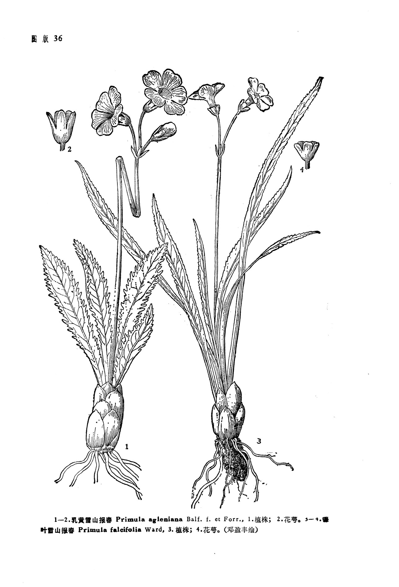 多年生草本。根状茎粗短,具粗长须根。叶丛基部有鳞片包叠,呈鳞茎状,高2-5厘米;鳞片卵形至卵状披针形,先端钝圆或具凸尖头,鲜时带红色。叶线状披针形,花期连柄长5-20厘米,宽5-10厘米,果期长可达30厘米,先端锐尖,茎部渐狭窄,边缘具小锯齿,上面深绿色,下面淡绿色,中肋宽,在下面隆起,侧脉纤细,不明显;叶柄甚短或长达叶片的1/2。花葶高10-20厘米,顶生1-2花,稀3-4花;苞片披针形,长7-15毫米;花梗稍粗壮,长1.5-2厘米,果时长可达5.5厘米;花萼杯状,长5-8毫米,分裂近达中部,裂片近四方形,宽约2.5毫米,先端圆形或截形;花冠黄色,冠筒长12-13毫米,冠檐直径2.5-3厘米,裂片扁圆形,宽约1厘米,全缘;长花柱花:雄蕊着生处距冠筒基部约4.5毫米,花柱长约8毫米;短花柱花:雄蕊着生于冠筒上部,距基部约9. 5毫米,花柱长约4毫米。蒴果稍长于宿存花萼。花期7月,果期8月。