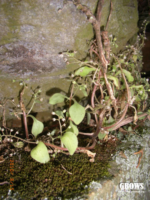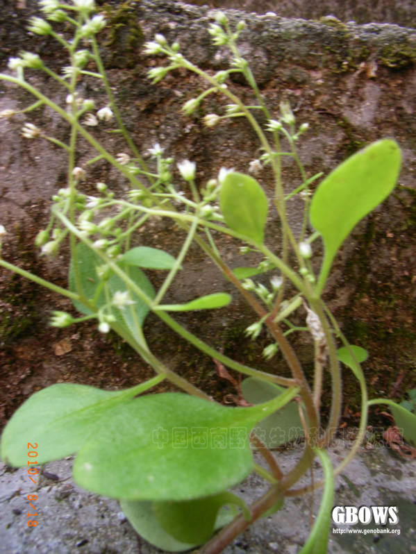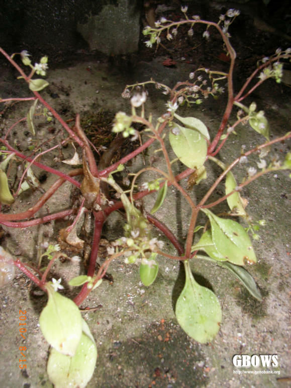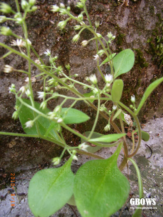 一年生草本。植株全体有腺毛。茎斜上,分枝多,细弱,高7-25厘米。下部叶对生或4叶轮生,上部叶互生,卵形至宽卵形,长2-4厘米,宽1.4-2.5厘米,先端急尖,圆钝,基部宽楔形并下延成柄,叶柄长1-2厘米。花序疏圆锥状;花少数,两性;花梗长4-8毫米;萼片5,长圆形至披针形,长2毫米,先端近急尖;花瓣5,白色,长圆形,长3-4毫米,先端渐尖;雄蕊10,长2-3毫米;鳞片5,宽匙形,先端有微缺至浅裂;心皮5,长2.5-5毫米,略叉开。种子长圆状卵形,有纵纹。花期4月(福建以南)至5-6月(浙江等省),果期8月。