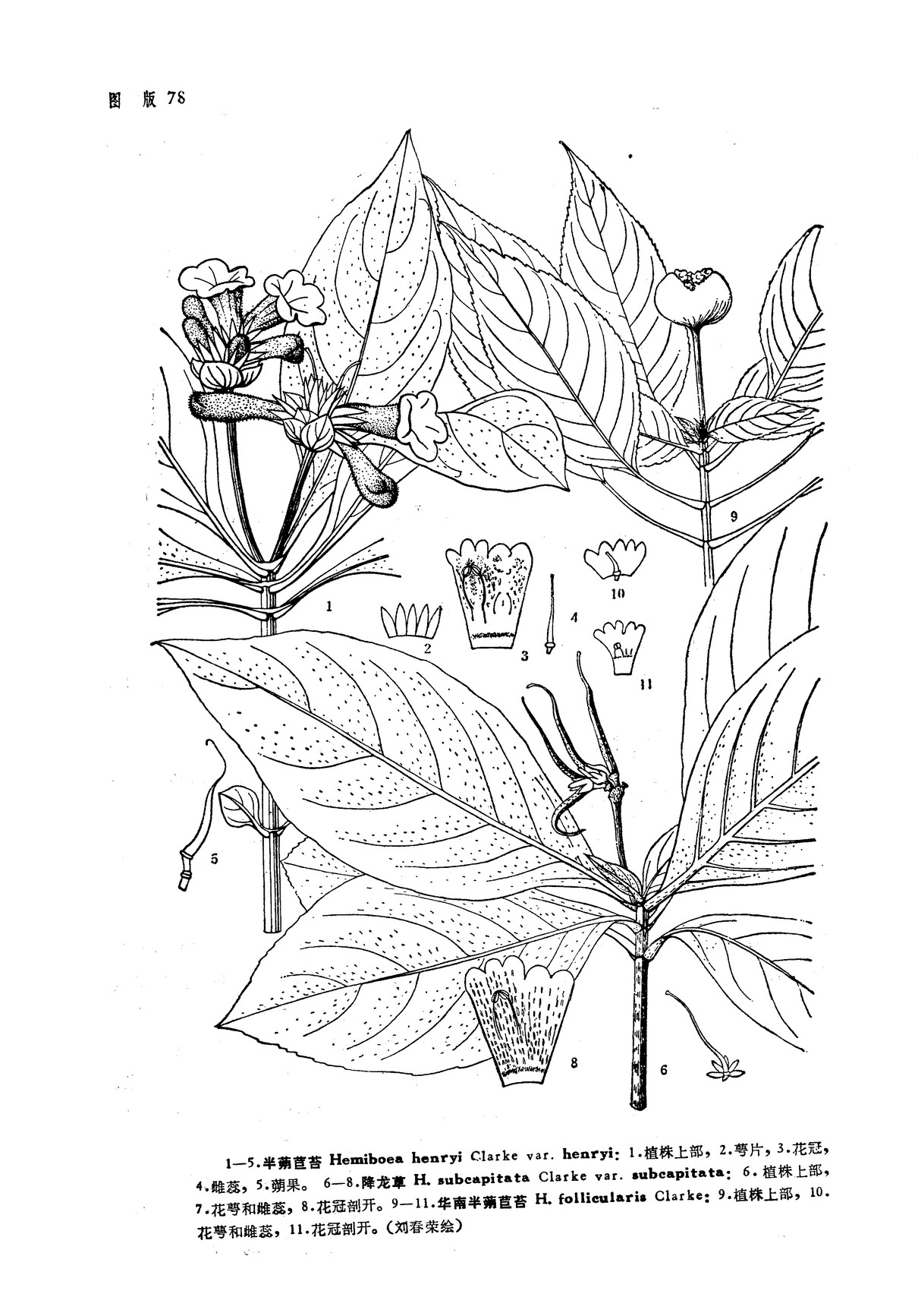 多年生草本。茎高10-40厘米,肉质,无毛或疏生白色短柔毛,散生紫褐色斑点,不分枝,具4-7节。叶对生;叶片稍肉质,干时草质,椭圆形、卵状披针形或倒卵状披针形,长3-22厘米,宽1.4-8厘米,全缘或中部以上具浅钝齿,顶端急尖或渐尖,基部楔形或下延,常不相等,上面散生短柔毛或近无毛,深绿色,背面无毛或沿脉疏生短柔毛,淡绿色或紫红色;皮下散生蠕虫状石细胞;侧脉每侧5-6条;叶柄长0.5-5.5厘米。聚伞花序腋生或假顶生,具(1-)3-10余花;花序梗长2-4(-13)厘米,无毛;总苞球形,直径1.5-2.2厘米,顶端具突尖,无毛,开裂后呈船形;花梗粗壮,长2-5毫米,无毛。萼片5,长椭圆形,长6-9毫米,宽3-4毫米,无毛,干时膜质。花冠白色,具紫斑,长3.5-4.2厘米;花冠筒长2.8-3.5厘米,外面疏生腺状短柔毛,内面基部上方5-6毫米处有一毛环。口部直径13-15毫米,基部上方直径5-6毫米;上唇长5-6毫米,2浅裂,裂片半圆形,下唇长6-8毫米,3浅裂,裂片半圆形。雄蕊:花丝着生于距花冠基部14-15毫米处,长8-13毫米,狭线形,无毛,花药椭圆形,长3-4毫米,顶端连着;退化雄蕊3,中央1个小,长2毫米;侧面2个长5-8毫米,顶端小头状,分离。花盘环状,高1-1.2毫米。雌蕊长3.2-3.5厘米,子房线形,无毛,柱头钝,略宽于花柱。蒴果线状披针形,多少弯曲,长1.5-2.2厘米,基部宽3-4毫米,无毛。花期9-10月,果期10-12月。