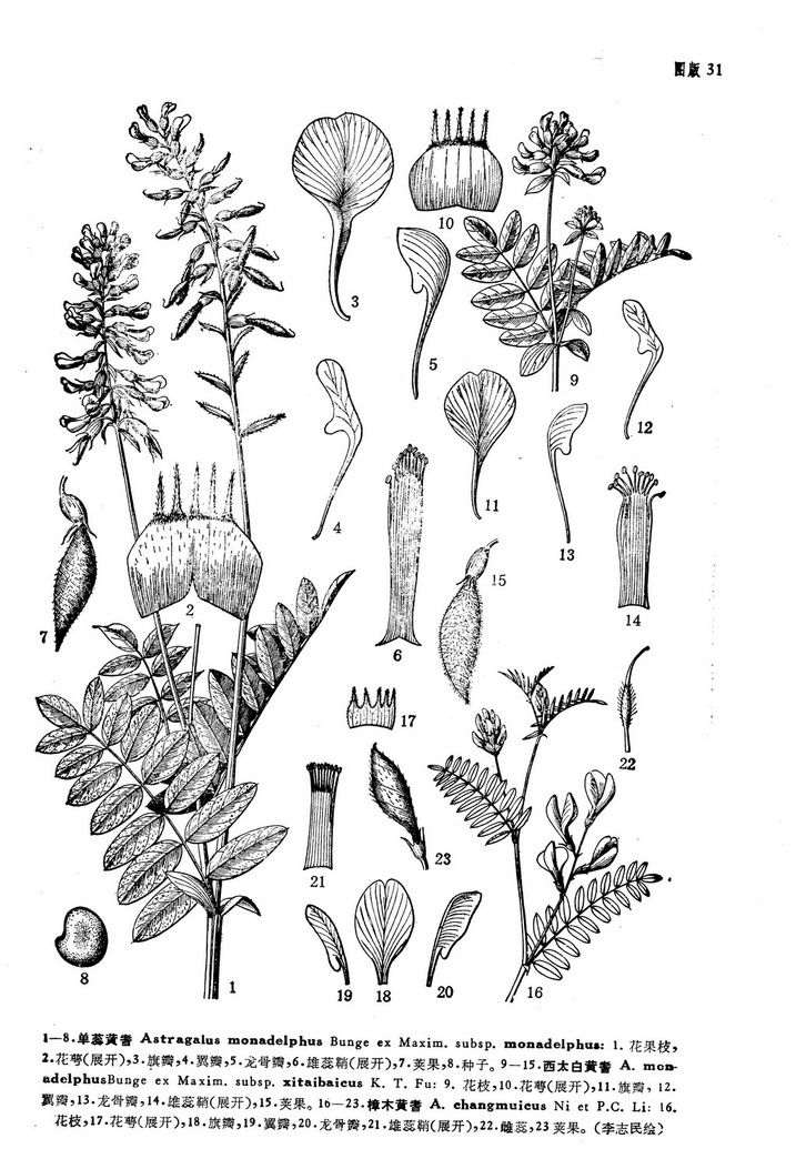 多年生草本;根圆锥形,直径5-7毫米,黄褐色,有分枝。茎丛生,高30-70厘米,直径2.5-4毫米,无毛,有条棱。羽状复叶有9-15片小叶,长7-9厘米,近无毛或叶轴上面具白色疏毛;托叶离生,长圆状披针形,长10-12毫米,先端尖,干膜质,有缘毛;叶柄长5-20毫米;小叶对生,长圆状披针形,或长圆状椭圆形,长6-24毫米,宽4-11毫米,先端圆形,具短尖头,基部圆形或钝圆形,上面无毛,下面疏生柔毛,小叶柄长约1毫米,疏生白色长毛。总状花序疏生10-16花,无毛或散生白色毛;总花梗长4-12厘米,较叶长;苞片线形至狭椭圆形,长8-10毫米,宽2-3毫米,具缘毛;花梗长1-3毫米,被白色或褐色开展毛;花萼钟状,长7-7.5毫米,散生伏毛,萼筒长5-6毫米,萼齿披针形,长约2.5毫米,内面及口部被褐色毛;花冠黄色;旗瓣圆匙形,长12-13毫米,瓣片近圆形,长7-8毫米,宽6-7毫米,先端微缺,中部以下渐狭为长柄,翼瓣与旗瓣近等长,瓣片长圆形,长5-7毫米,宽1.6-2毫米,先端圆,基部耳向外展,瓣柄长6-8毫米,龙骨瓣长10-11毫米,瓣片近半圆形,长4-4.5毫米,宽2.5-3毫米,先端钝尖,瓣柄长约6.5毫米;子房密被白色半开展毛,柄长5-6毫米。荚果略膨胀,披针形,长约2厘米,宽4.5-5毫,先端渐尖,基部狭入果颈,被白色柔毛,1室,含4-5粒种子,果颈露出宿萼很多;种子深褐色,宽肾形,长约2.5毫米,横宽约3毫米,平滑。花期7-8月,果期8-9月。