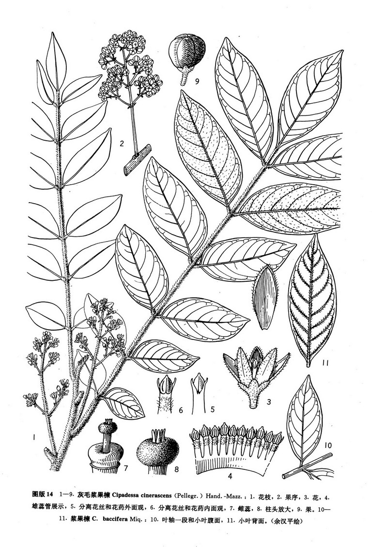 Cipadessa cinerascens (Pellegr.) Hand. -Mazz. Symb. Sin. 7: 632. 1933; Harms in Engl. u Prantl, Nat. Pflanzenfam. ed. 2, 19b (1): 94. 1940; Chun in Sunyatsenia 4 (3-4): 236. 1940; 侯宽昭、陈德昭, 植物分类学报4: 33. 1955; 陈嵘, 中国树木分类学601. 1957; 中国高等植物图鉴2: 572, 图2873. 1972:云南植物志1: 217, 图版51: 1-2. 1977; 云南种子植物名录, 上册830. 1984; 广东植物志2: 298, 图193. 1991. ——C. fruticosa Bl. var. cinerascens Pellegr. in Lecomte, Fl. Gen. Indo-Chine 1: 784. 1911.——C. baccifera (Roth.)Miq. var. sinensis Rehd. et Wils. in Sarg. Pl. Wils. 2: 159. 1914.——C. sinensis (Rehd. et Wils.)Hand. -Mazz. in Karst. U. Schenck Vegetb. 20. R. H. 7. 1930. in textu., nomen.——Rhus blinii Levl. Fl Kouy-Tcheou 411. 1914.